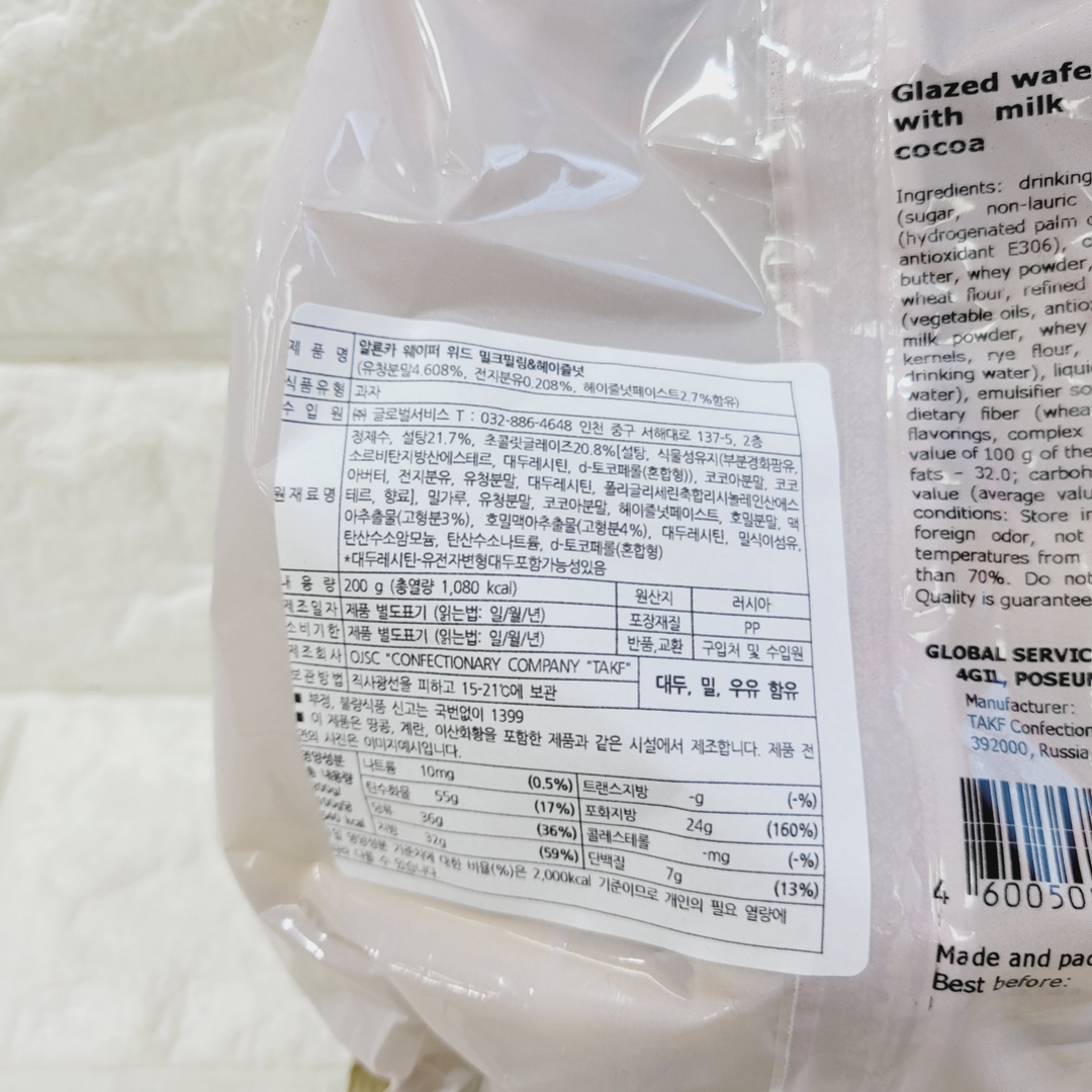 [730117] 알룐카 웨이퍼 위트 밀크필링 & 헤이즐넛 200g